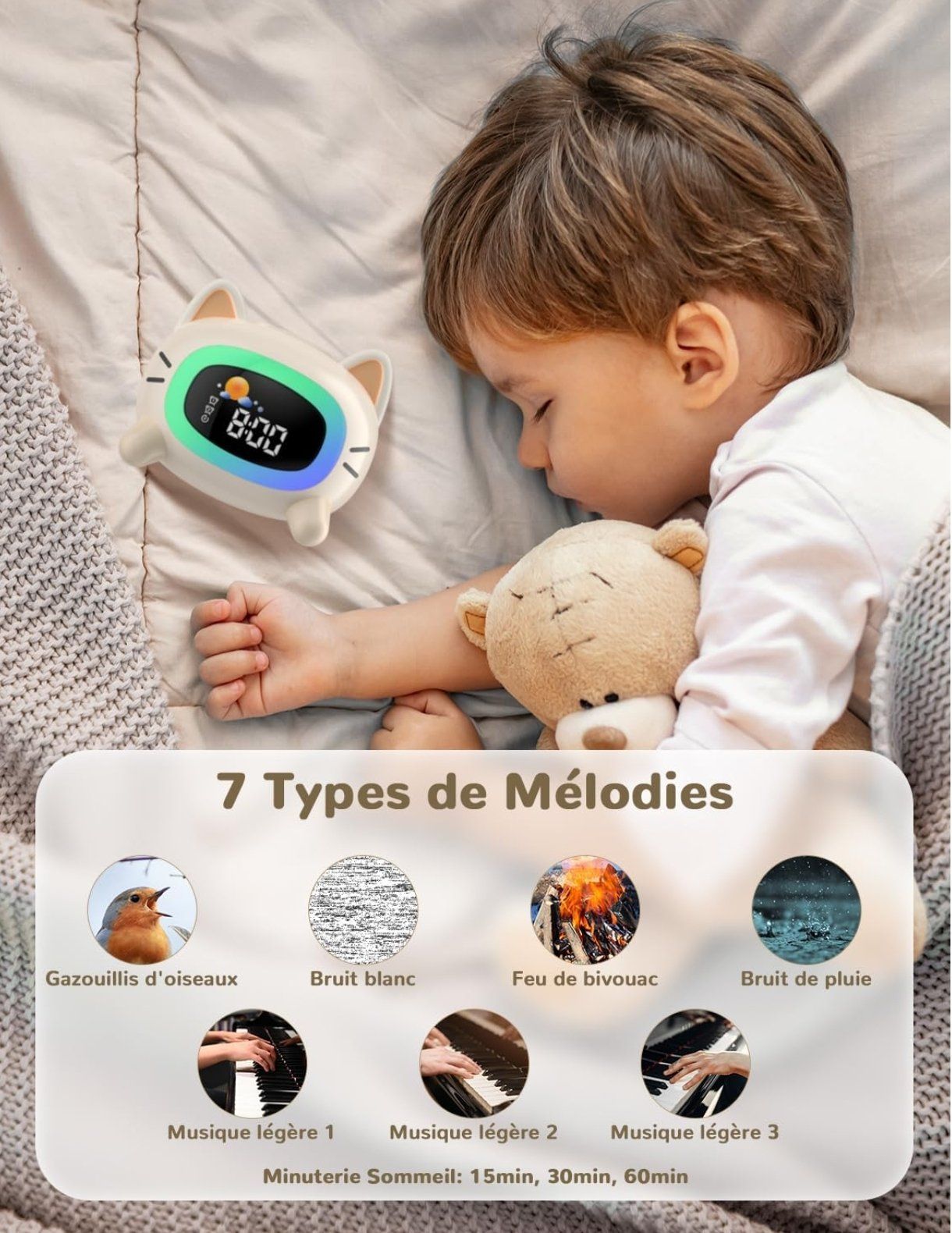 Réveil Enfant Chat LED – Veilleuse Multicolore, Musiques & Double Alarme – Recharge USB-C