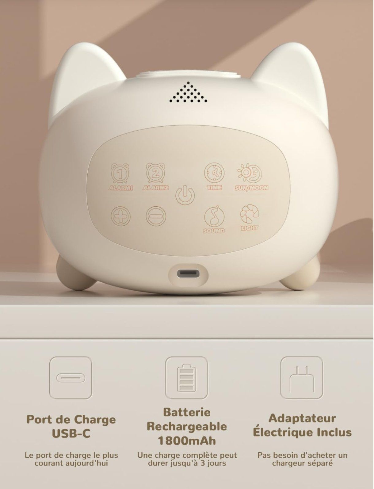 Réveil veilleuse en forme de chat pour enfants. Luminosité réglable, sons apaisants et double alarme pour un réveil tout en douceur.