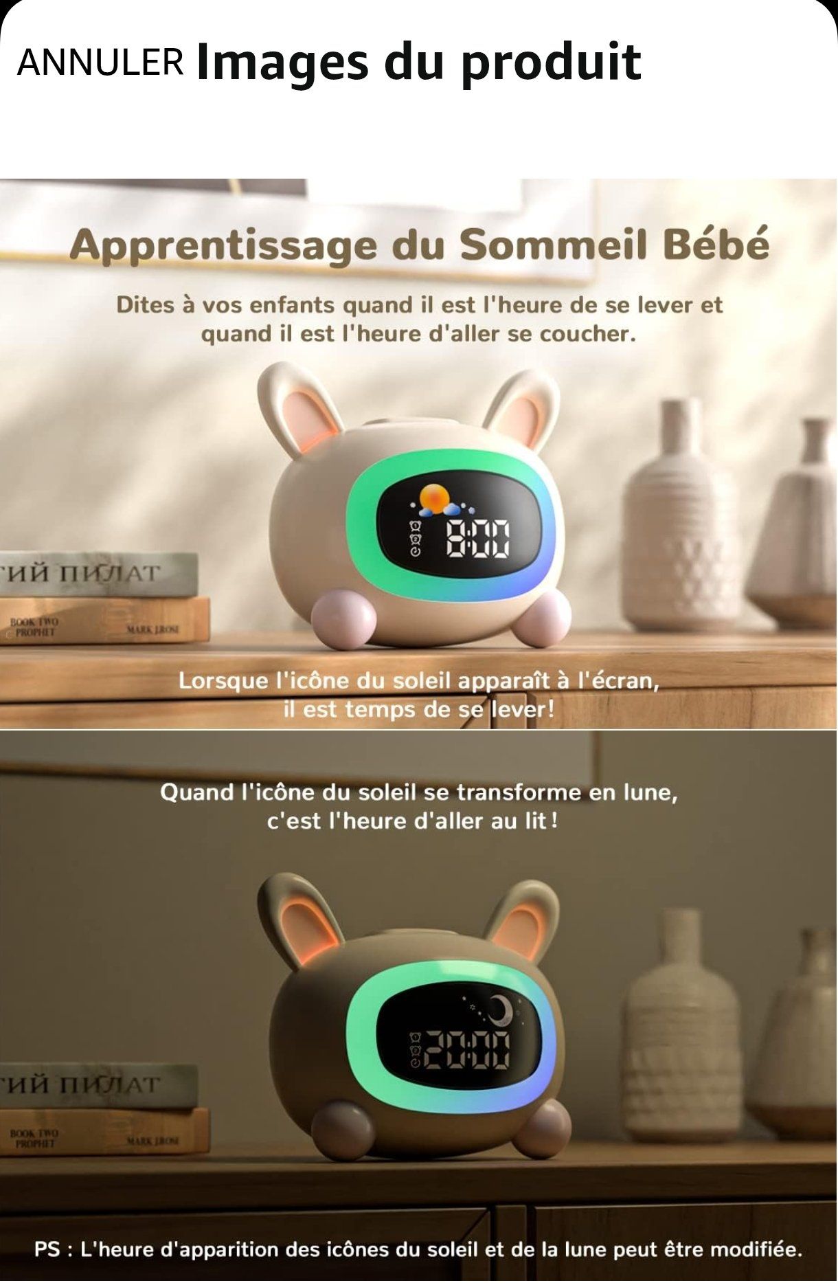 Réveil veilleuse en forme de lapin avec oreilles lumineuses, sons doux et double alarme. Idéal pour apprendre à se réveiller en douceur.